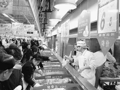 近日,苏州市场猪肉的价格持续下降,部分超市开展猪肉促销活动,零售猪肉促销价下降了三成左右,许多顾客在购买促销的猪肉。王建康摄