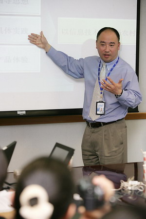 图为英特尔全球副总裁、中国区总裁杨叙介绍电脑下乡策略