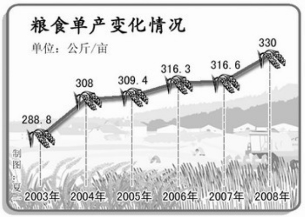 2008年,我国粮食平均亩产达到330公斤,比历史最高的上年增加13.4公斤,增长4.2%,实现新中国成立以来第一次连续五年单产创历史新高。单产提高对总产增加的贡献率达到80%以上,为近五年最高。