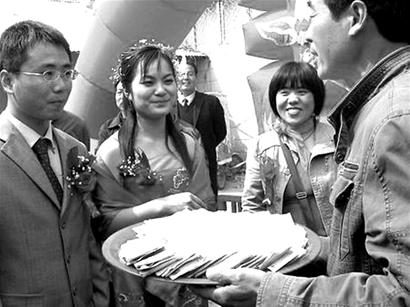 荆楚网消息 (楚天金报) 据《大河报》报道前日,河南柘城县梁庄乡才庄村的大学生杨宏伟把婚礼办成了一场捐赠仪式,现场将全部礼金1.46万元捐给村里(如上图)。杨宏伟说,“现在的婚礼往往是请来众多高级轿车,然后在豪华宾馆摆上若干桌酒席,请亲朋好友来吃一顿,既铺张浪费又没多大意义,还不如办得简单些,用节约下来的钱做些更有意义的事。”在得到妻子和父母的支持后,他决定把钱捐给村里建老年人活动中心和村文化广场。