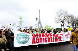 25日,由法国农民组成的示威者在巴黎艾菲尔铁塔前举着“拯救农业”的标语,以抗议法国农业部长米歇尔·巴尼耶的一项关于重新分配相关财政援助的计划。