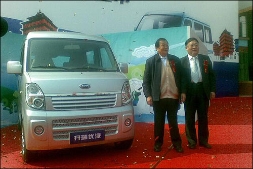 仪式上,奇瑞公司副总经理,开瑞微车公司总经理陆建辉,华西村老书记吴仁宝共同为优派上市揭幕。