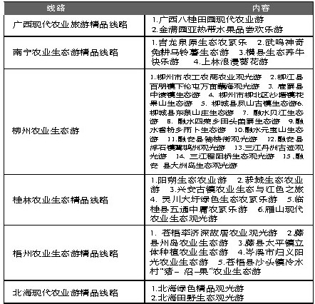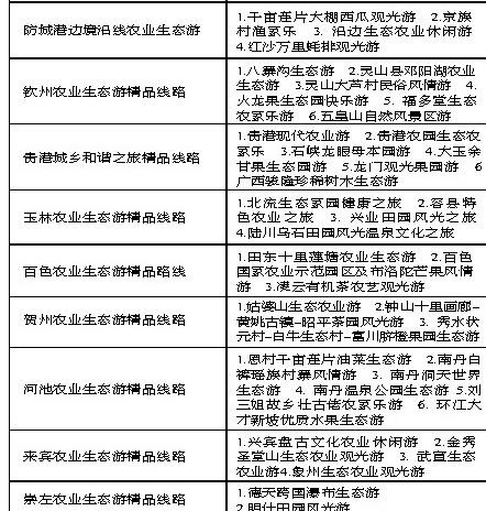 广西新闻网-当代生活报讯(记者苗丽)昨日,记者从自治区旅游局了解到,目前,广西在册的国家级农业旅游示范点已有34家,并初步形成了15条生态农业旅游精品线路(见下表)。