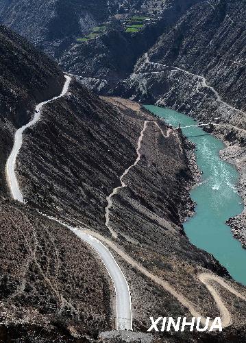 这是海拔3000多米的云南省迪庆藏族自治州德钦县云岭乡境内的柏油公路(左),中间是原有的弯曲土路,旁边是碧绿清澈的澜沧江(2月15日摄)。