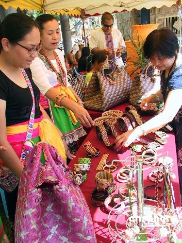 为迎接大陆居民赴台旅游首发团,台东少数民族在一年一度的丰年祭活动中,推出民族特色浓郁的手工艺品,吸引大陆客。图为一北京首发团成员在选购当地少数民族的手工艺品。 中新社发 徐长安 摄