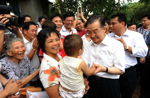 这是4月19日,温家宝走访海口市红旗镇本立村,看望村民,了解他们的生产生活情况。 新华社记者黄敬文摄