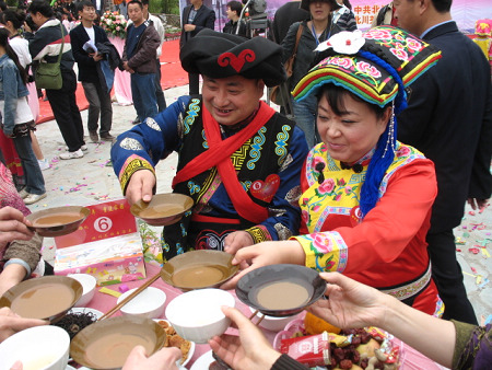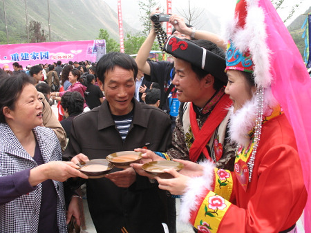 仪式进入到最高潮,随着主持人宣布:让我们用喜庆的礼炮为他们甜美的爱情祝福,为美丽的北川祝福,为走过辉煌六十年的伟大祖国祝福!礼炮依次响起,在《欢乐的酒歌》的伴随下,羌族的姑娘小伙为新人们送上美酒,全场一起唱着酒歌共同祝福新人、新北川。