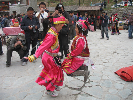 4月26日,四川省北川县擂鼓镇吉娜羌寨呈现出一派喜庆的气氛,家家户户门旁挂上了成串的象征着羌寨丰收与希望的金黄的玉米和火红的辣椒,门框上也挂上了用红绸缠绕的、羌族人特有的羊头骨。在羌寨广场的东侧矗立着一座用石头垒起的三层祭祀塔,祭祀塔石台的四角和顶端摆放着白云石和羊头骨以及德高望重的长者准备的祭品。广场四周插满了富有羌民族习俗特色图案的彩旗,一条由红色地毯铺成的“星光大道”贯穿广场,一座鲜花拱门矗立在大道中间,在广场南侧10门炮口扎着红飘带的礼宾炮一字排开,大道的两旁摆放了20桌坝坝宴席。