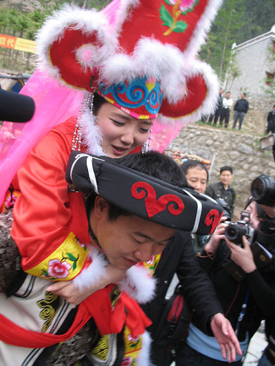 10点30分,新人们回到了羌寨,在优美、欢快的羌族音乐的伴奏下,杨大爷带领着由村民组成的知客队伍在广场按照羌家传统风俗迎接客人。在广场尽头的屋子里北川羌族民间艺术团的演员穿梭在新人们中间表演羌民族原生态的情歌对唱。《羌家姑娘绣彩绣》、《西呀拉沙》、《云朵美》、《美酒跟着歌声飞》。。。。。。一曲曲让来自四面八方的客人感受到了羌族音乐的无穷魅力,优美旋律中所表达的爱情主题更让人们品味到了羌家人爱的真谛。