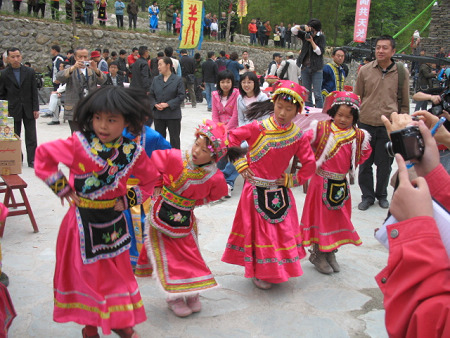 上午9点30分,广场上奏响了羌族歌曲《尔玛人的歌》,一场由北川县委县政府主办的主题为“牵手百年 重建家园”的重组家庭集体婚礼正式开始。20对新人身穿羌族的传统服装手牵着手踏上了“星光大道”,与在场的来宾和闻讯而来的中外记者见面。随后,新人们在婚礼主持人和北川羌族艺术团演员的带领下从羌寨出发前往寨子西边的山坡上植树。只见夫妻二人一个扶苗一个填土,而后共同提起了水桶为小树浇水。一种温情与幸福始终洋溢在整个植树过程中。