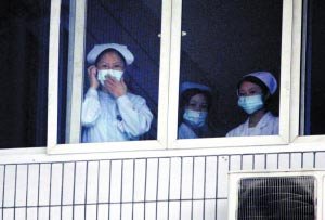 昨日,成都传染病医院的医护人员向外眺望聚集的大批记者。内地首例H1N1患者在此治疗。