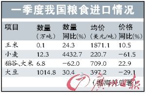 在品种上,大豆进口占八成以上, 一季度进口大豆1015万吨,增长30.4%,占同期我国粮食进口总量的84.2%。