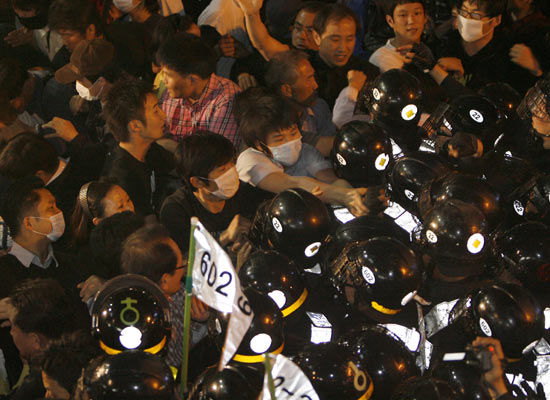 5月24日,悼念卢武铉的民众与警察冲突。
