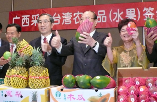 5月25日,广西采购台湾农产品(水果)签约仪式在台南举行。这次广西与台南县玉井乡农会签约购买凤梨、芭乐和木瓜三个品种,共1.8万箱、150多吨,采购金额200多万元人民币。