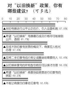 调查显示,67.0%的人认为,应对旧电器进行公平公正估价,引入监督机制;61.7%的人希望“以旧换新”电器最后成交价格尽可能做到公开、透明;57.0%的人认为在找不到旧家电发票的情况下,商家也应人性化办理;50.0%的人认为“以旧换新”家电的所有型号都应可换才合理;49.2%的人希望“以旧换新 ”商家协助顾客进行旧家电的拆卸。
