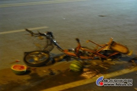在岔路学校的斜对面,有一排卖西瓜的摊点,一辆绿颜色的垃圾车被撞得支离破碎倒在一边,目击者说,这里是第二现场,当时在路边有很多人在买西瓜,肇事车把停在路边上的一辆垃圾车给撞飞了,垃圾车再砸向了西瓜摊。“当时买西瓜的人蛮多的,应该有人受伤,但估计问题不大!”后来记者得知,有两个安徽瓜农受伤,一男一女,男的叫王殿福,被撞到了腿部,女的叫李孝影,被撞了头。