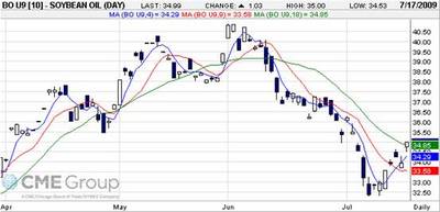 7月17日收盘时,8月豆油合约比一周前涨了1.98美分,报收34.82美分/磅;9月合约涨了2.01美分,报收34.99美分/磅。