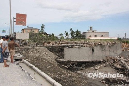 “莫拉克”台风重创台湾,重灾区之一的台东太麻里乡有数个住户被洪水冲走,平日的道路变成了河床。图为8月10日,几名当地居民来到现场,讲述一夕间的巨变。中新社发董会峰 摄