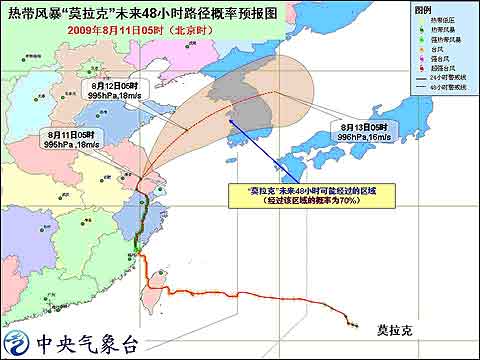 预计,“莫拉克”的中心将以每小时20公里左右的速度向北偏东方向移动,以后逐渐转向东北方向移动,强度缓慢减弱,并将于今天下午移入黄海西部海面。
