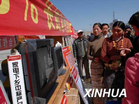 3月24日,甘肃省甘南藏族自治州合作市两位藏族妇女在了解家电下乡活动情况 新华社 后俊 摄