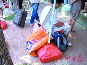 上午11时左右,阳光很毒,他正端着水杯喝水,突然发现地上一个男生在坐着休息,男生瘦瘦小小,戴着一副近视眼镜,身边是一个书包,和两蛇皮袋行李,一根扁担格外醒目。