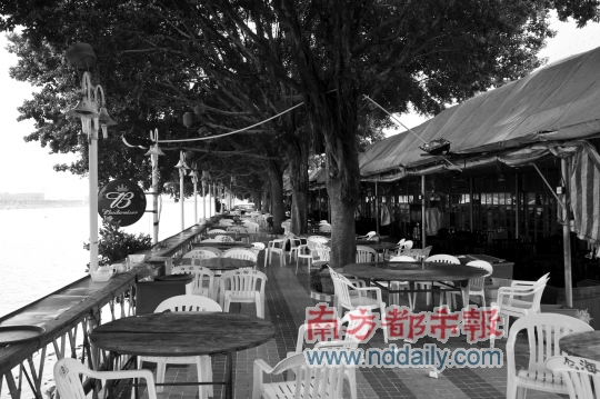 如果想与水更亲密接触,临江的长堤上也有不少酒楼和大排档,他们会搬出小桌子摆在江边的岸上,江景就在脚边,炒饭炒面、艇仔粥、小炒、海鲜,什么都有,很有些小情小调。