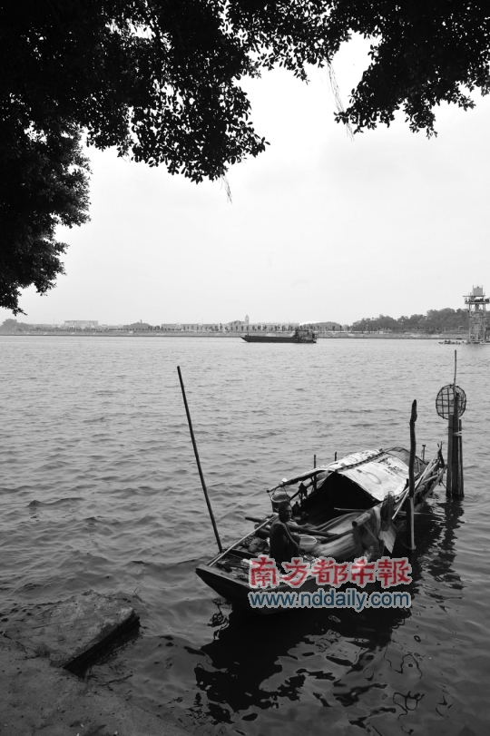 栏杆之下便是珠江,活色生香的珠江,这是我第一次在广州市看到真正把珠江当成泳池的快乐人群———甚至不能说泳池,那太拘谨了,应该说是我们小时候的河边游泳的自由感觉。虽然在我们看来,那水仍然有点脏,不够清,但所有大人小孩的投入程度完全显示了他们对于水质的不介意。有中年村民将自家的狗带来岸边洗澡,揉搓的手势比对待自家老婆温柔得多;有年轻男子带着宠物狗一同戏水,双双躺在水面上,惬意得不行;孩子们玩得最疯,水面上有泳圈不时飞来飞去,孩子们欢叫着在水底扭成一团。