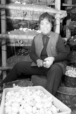 记者走进大棚一看,大棚内一片漆黑,仅棚口处有微弱的灯光,顺着灯光隐约可以看见棚内搭设有8层立体棚架,每层都长满大小不等的双孢菇,灯光下一位大嫂正在对刚刚采摘下来的双孢菇进行去根处理。成熟的双孢菇每个大约直径4至5厘米,既小巧又雪白,很是可爱。记者很奇怪,一般的蔬菜大棚都是光线充足,这里怎么会这么昏暗呢?任怀才回答:“种植双孢菇是不需要灯光的,在阴暗的环境下菇才会长得洁白、肥大,若光线太强,表面会硬化,畸形菇就会增多,其价格就会差很多。我们在这里搭设了8层立体棚架,使原先占地面积200平方米的大棚,实际使用起来可以达到2000平方米左右。”