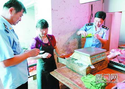 前日上午,记者联系莲前工商所、厦门市贸发局市场运行处对“亿家香”摊位进行了突击检查。这个摊位的猪肉都是从正规渠道进的——一位执法人员检查了摊位当天的检验单,单据齐全。