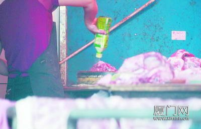 前日,记者联系莲前工商所、厦门市贸发局市场运行处,对这处肉摊进行了突击检查。初步检查结果是:白色粉末为食用碱。摊贩对使用碱粉的原因讳莫如深,最后吐露的实情却颇出人意料。