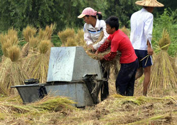 8月7日,柳江县成团镇甘塘村农民给早稻脱粒。