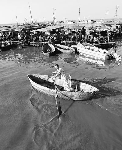 8月8日,一名居民在蓝藻聚集的巢湖湖面上划船。