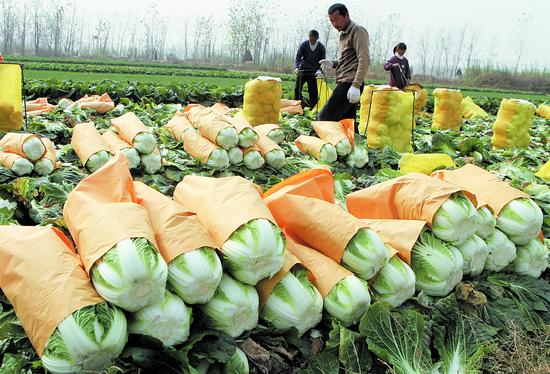 安徽省蒙城县庄周办事处马店蔬菜基地,200多吨刚采摘的大白菜正准备运往上海等 地出售。IC 资料