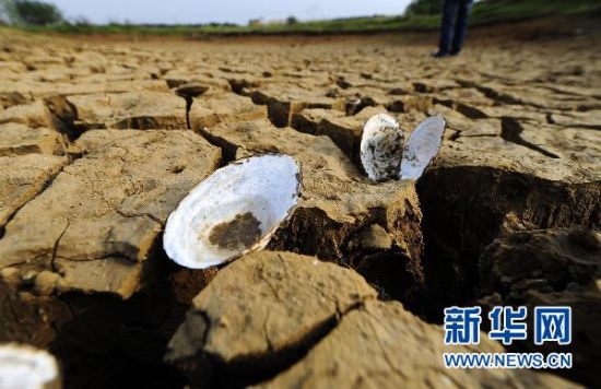 湖北省孝昌县一处干涸池塘底部的河蚌壳(5月3日摄)。