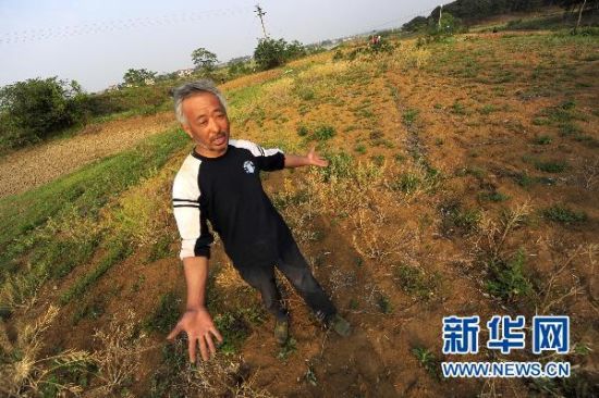 湖北省孝昌县花西乡幸光村二组的黄胜华家里的油菜由于干旱几乎绝收(5月3日摄)。