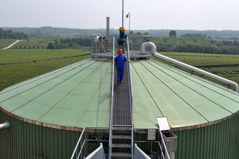 9月2日,浙江兴泰农牧科技有限公司沼气发电项目的技术人员在厌氧发酵池上检查搅拌设备。