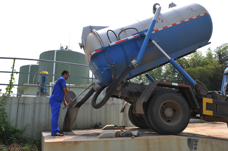 9月2日,工作人员将沼液槽车运来的猪粪倒入沼气发电厂的池中。