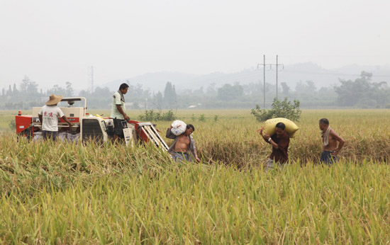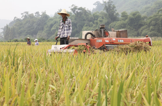 9月1日,在四川眉山市彭山县牧马镇的成片稻田里,来自江苏的收割机手冒着高温帮助农民抢收稻谷。