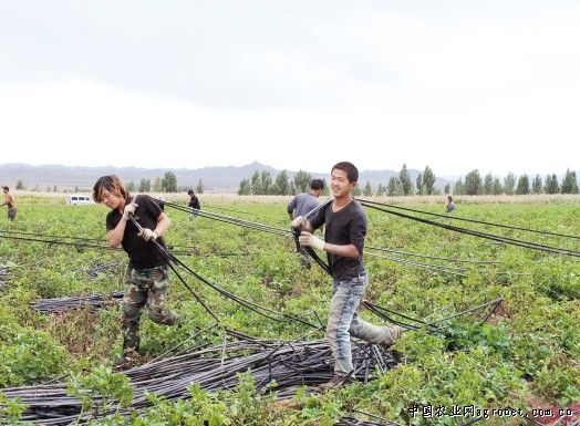 近日,在固阳县金山镇下八份子村的滴灌马铃薯田里,农民丁海清身披厚褂子穿梭于田地间,把固定滴灌毛管的卡子一一收好,十几名农民工热火朝天地拉滴灌毛管,这是为收马铃薯做前期准备。