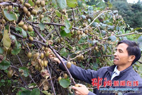10月5日,隆回县小沙江镇白银村种植户王槐荫在采收龙藏红猕猴桃。今年,该镇农民种植的3500多亩良种猕猴桃喜获丰收,龙藏红猕猴桃就地销售每公斤12元,翠玉猕猴桃每公斤6元,热销当地市场和长沙、深圳、上海等地。