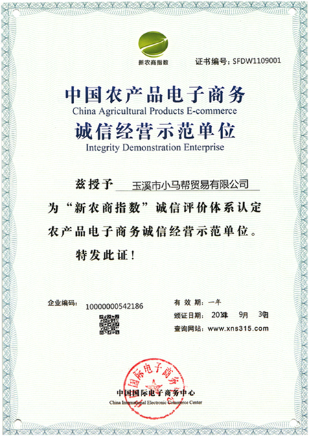 据悉,"中国农产品电子商务诚信经营示范单位"认证服务是以商务部中国国际电子商务中心"新农商指数"诚信评价体系为依托,对涉农商家的基本信息公开度、电子商务应用水平、身份认证情况、荣誉及证书信息、互联网活跃度、客户评价等指标进行综合评分,达到评价体系三星(含)以上等级后颁发示范证书,以此鼓励涉农企业开展电子商务,塑造农产品诚信品牌,增加企业在电子商务和实体交易中的交易成功率。凡在国家工商部门或民政部门进行有效登记注册的农民专业合作组织、农业类企业均可申请。
