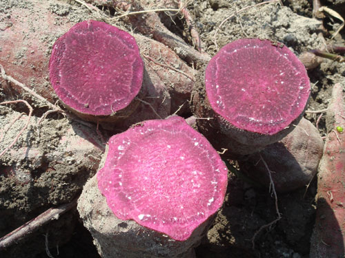紫色甘薯,薯肉呈紫色至深紫色,除具有普通甘薯的营养成分外,还富含硒元素和花青素,具有抗氧化、预防和治疗心血管疾病等多种药用功能,是一种具有食用、药用及保健于一体的理想作物。紫色甘薯除鲜食外,还可深加工提取天然着色剂花青素、加工全粉做各种糕点主料或配料,加工薯片等营养休闲食品,市场需求大。