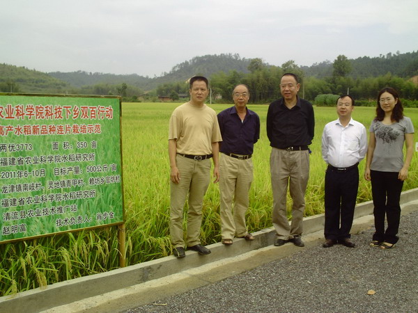 2011年10月12日,福建省农科院水稻所育种专家,赵明富博士一行在清流县政府黄宇翔副县长的陪同下,深入该县粮食高产创建示范区龙津镇南歧村,察看福建省农科院农业科技下乡双百活动的优质稻“两优3773”连片种植示范基地,赵明富博士一行看着金灿灿、澄淀淀的稻子,知道自己多年付出取得的科技成果,在清流落地生根了,不禁喜上眉梢。优质稻“两优3773”是赵明富博士经过多年培育而成的优良品种,稻米荣获福建省首届地产优质米银奖,米饭清香、松软可口,广受消费者青睐。品种生育期适中,高产抗病,适宜烟后栽培。清流县引种3年,并作为农业部粮食高产创建的主推品种之一,今年在龙津镇、灵地镇等建立百亩示范片,稻苗群体长势良好,预计平均亩产550-600公斤。