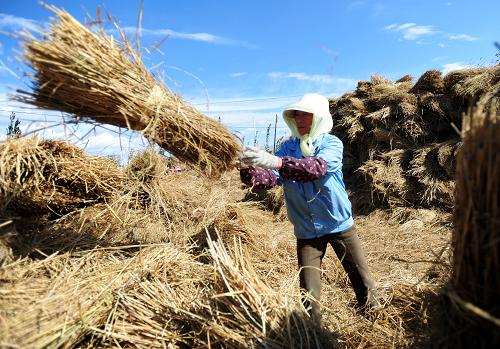 甘肃省靖远县三滩乡中一村农民把稻草打捆用以编制草帘(10月14日摄)。