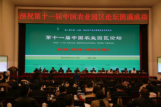 2011年10月15-18日,由中国农学会、中国农业科学院、中国农业大学、山西省农业厅联合主办的第十一届中国农业园区论坛在山西太原顺利召开。作为第二届中国(山西)特色农产品交易博览会系列活动之一,论坛以“园区创新、区域转型、农业增收、强农惠民”为主题,旨在通过论坛召开,宣介国内外农业园区创建的先进理念和经营模式,推荐现代农业最新科研技术和产品,进一步推动农业园区健康持续发展,促进农业转型发展、科学发展、跨越发展。