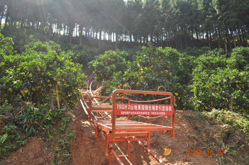 华南农业大学研制的7SGH-2山地果园双轨道运输机在尤溪县洋中闽珍果蔬合作社投入使用。这种运输机为无人驾驶,用遥控器遥控,靠电力运行,一次可运输200~400公斤橘子。运输机既能在坡度陡峭的地形中运输,又能在较密集果树中穿行,还可以自由地转弯,可用于山地果园中果实、肥料等的运输及喷雾作业。