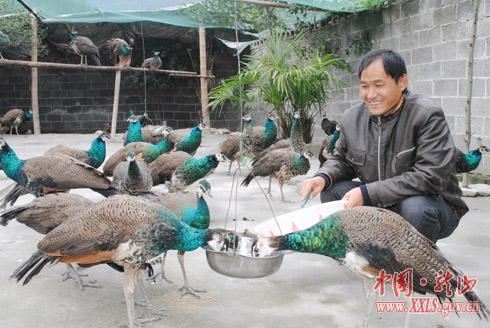 周泽在阿娇蓝孔雀养殖基地给孔雀喂食