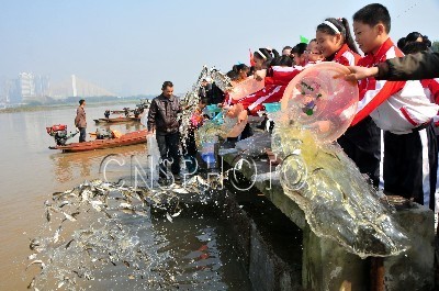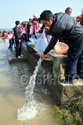 11月10日,由四川省南充市水务局主办的“南充市2011年嘉陵江鱼类人工增殖放流”活动在嘉陵江四川省南充市高坪区段举行,来自南充的群众、渔民、小学生代表将黄颡鱼、南方大口鲢等7个种类的258万尾鱼苗放流嘉陵江。据了解,今年南充渔政部门组织向嘉陵江人工增殖放流各种鱼种800余万尾,对嘉陵江鱼类资源进行有效补充和修复。