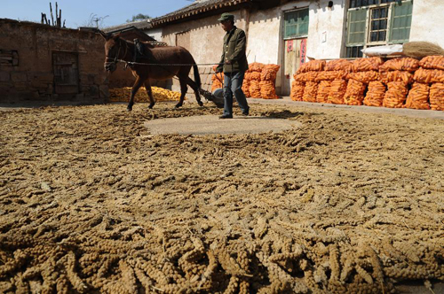 在山西省沁县次村乡次村,村民常国宏赶着骡子在自家的院落中碾小米(10月29日摄)。