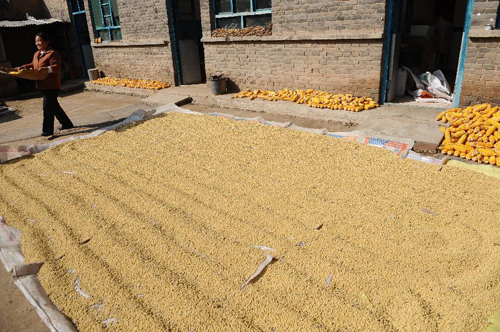 在山西省沁县次村乡次村,村民在院子里晾晒粮食(10月29日摄)。